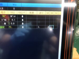 他には、深穴で最初はショートドリルで加工後、ロングドリルで加工しますが、ロングドリルで加工する時はショートの加工の深さまでは、穴が開いていて加工が出来ているので、通常の2倍の送り速度にしておき、以後は削る手前からは半分の送りになるように設定しています。