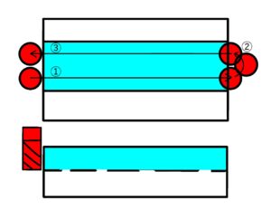 - ①エンドミルで入りは全面がワークにあたり負荷は大きいので送りを落とします。