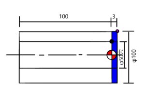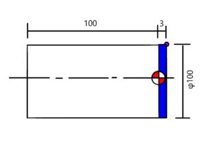 これで行くと端面を3ミリ削る事になり全長が100になります。上図の青色が取り代です。